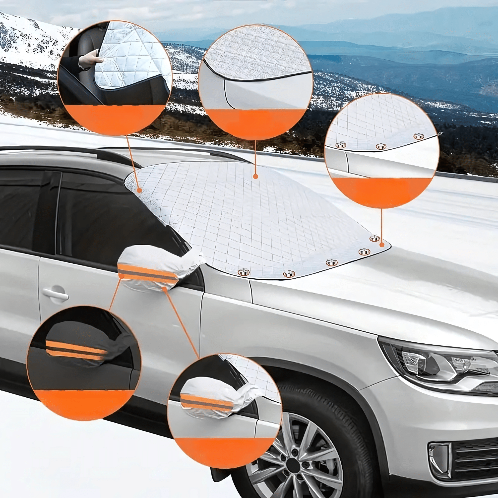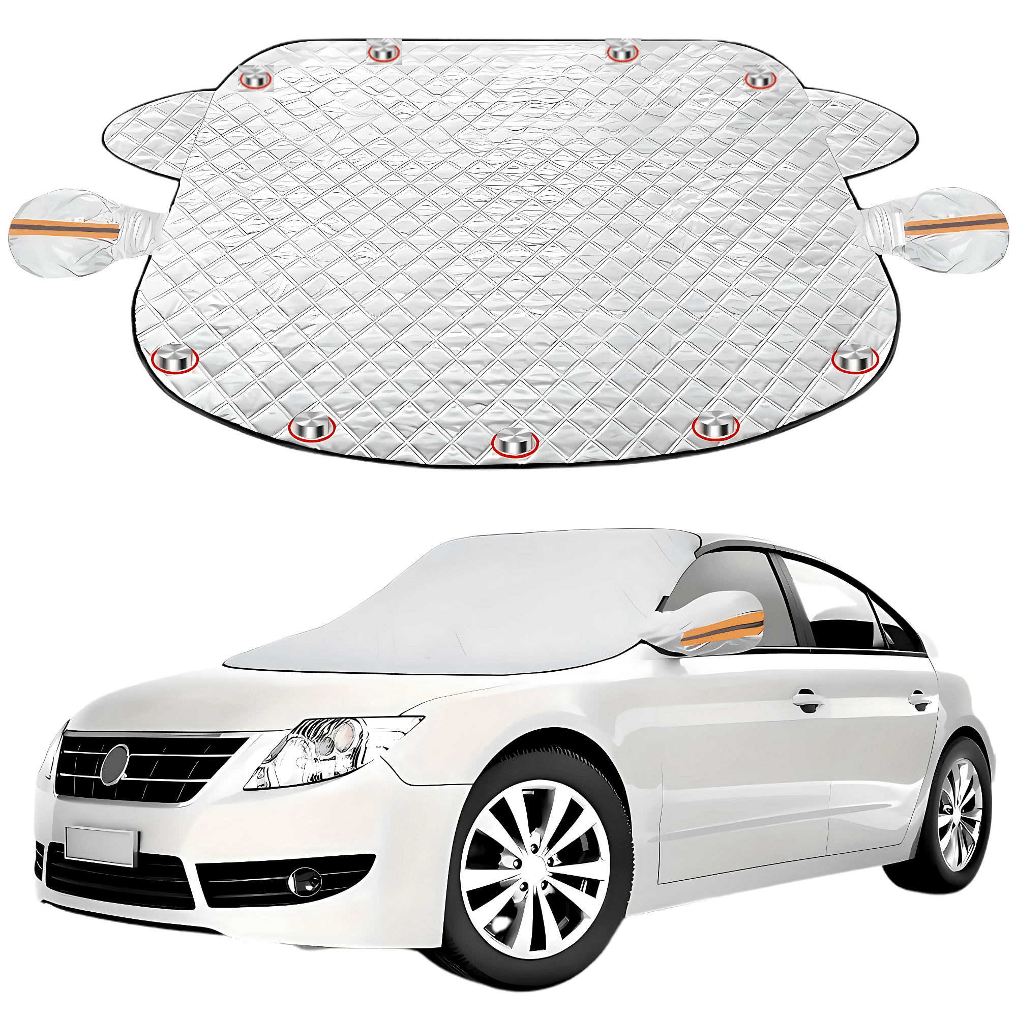 Wytrzymała mata ochronna na szybę, wyposażona w 9 wbudowanych w materiał magnesów, które zapewniają stabilne mocowanie.Nakładki ochronne na lusterka z odblaskowymi elementami, które poprawiają widoczność i bezpieczeństwo po zmroku.Praktyczne opakowanie foliowe, ułatwiające przechowywanie maty, gdy nie jest używana – idealne na każdą porę roku.