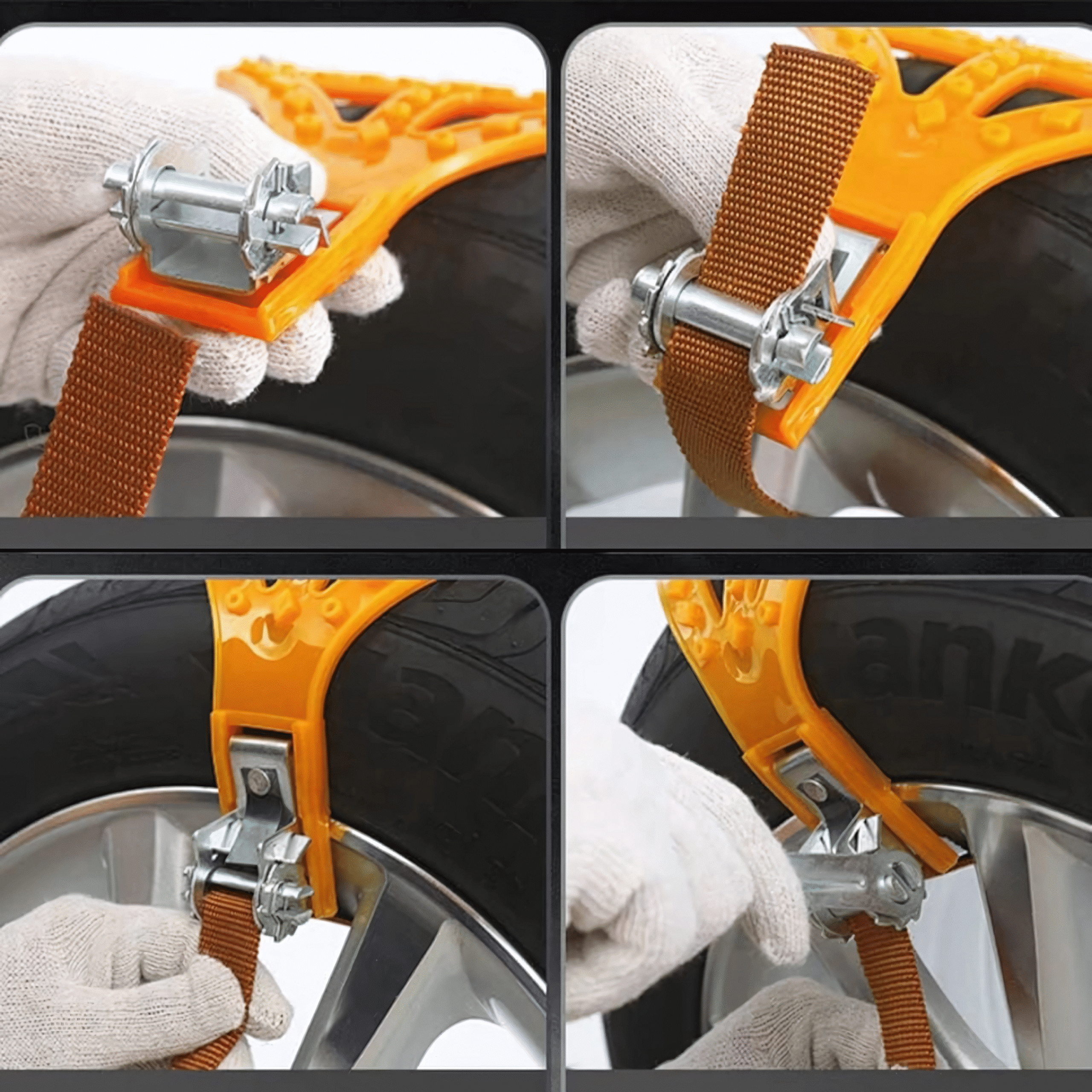 → Krok 3:Przeciągnij pasy przez mechanizm montażowy i zaciągnij je na zewnątrz opony.(możesz pomóc sobie hakiem z zestwu)